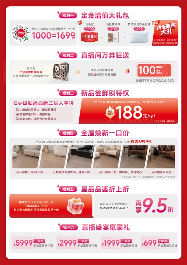 如果说 “低价高品质地板” 是生活家超级星品日的核心王牌,那么围绕消费全流程打造的连环福利,就是让这场盛宴更具吸引力的加分项。生活家地板深知,年轻人装修时不仅关注产品价格,更在意整个购物过程的便捷性与性价比,因此每年超级新品日也为消费者精心设计多重福利环节。如定金增值大礼包、直播间万券狂送、全屋焕新一口价、直播盛宴嬴豪礼等。全国门店同步开展的 “星品品鉴日” 欢迎随时打卡,到店不仅能亲手触摸地板质感,感受真实脚感,还能享受专属折上折优惠,双重惊喜叠加,真正实现线上线下无缝衔接的购物体验。