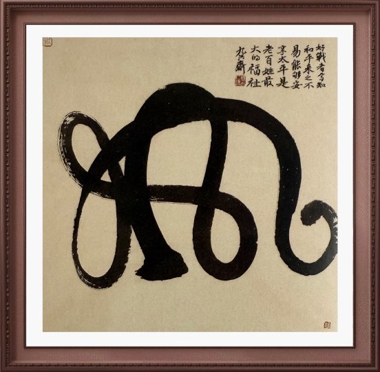他的书法作品,堪称一场视觉与精神的盛宴。笔走龙蛇间,满纸云烟缭绕,气韵生动流转。每一笔、每一划,都蕴含着他对汉字架构、布局、空间的独特理解与创新诠释。他将“象”与“意”有形化,通过精心的布局设计,让单幅作品如一座山峦般巍峨,不仅带来强烈的视觉美感,更蕴含着观世悟道的深邃隐喻。这种对形式与语言的极致追求,使得他的书法作品超越了单纯的文字书写,成为表达内心灵韵、展现理性思维与形象思维交融的艺术杰作。